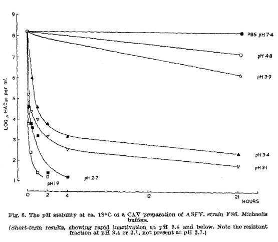 王博士答:可以,這里指的是飲水酸化。談到酸性物質(zhì)和非洲豬瘟,這里有一篇英國動(dòng)物病毒研究所的Plowright和Parker于在1967年發(fā)表的文章。這篇文章從加熱和pH對非洲豬瘟病毒穩(wěn)定的影響進(jìn)行了研究。請看這個(gè)圖,在pH7.4時(shí)非洲豬瘟病毒穩(wěn)定性沒有變化,而在pH4.8時(shí)非洲豬瘟病毒穩(wěn)定性開始下降。這篇論文給我們的啟示是:如果能夠降低豬的飼料(包括飲水)的pH,就可以“破壞”非洲豬瘟病毒。我們的四驅(qū)雙酸發(fā)酵料的pH在4.5以下,再輔以酸化的飲水(pH4.0),再加上胃酸的作用,[AW1] 對可能存在的非洲豬瘟病毒就會(huì)造成毀滅性打擊。