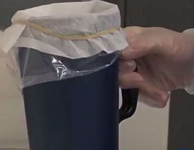 (4)準(zhǔn)備采精杯。準(zhǔn)備一個(gè)新的集精袋,貼壁套在干凈的采精杯內(nèi)。使用精液過(guò)濾紙(或無(wú)菌紗布)覆蓋在采精杯上,用一條新的橡皮筋固定。