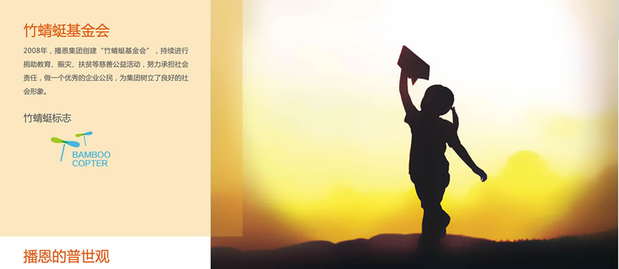 播恩于2008年創(chuàng)建“竹蜻蜓慈善”。持續(xù)進(jìn)行捐助教育、賑災(zāi)、扶貧等慈善公益活動(dòng),努力承擔(dān)社會(huì)責(zé)任,做一個(gè)優(yōu)秀的企業(yè)公民,為播恩樹立了良好的社會(huì)形象。