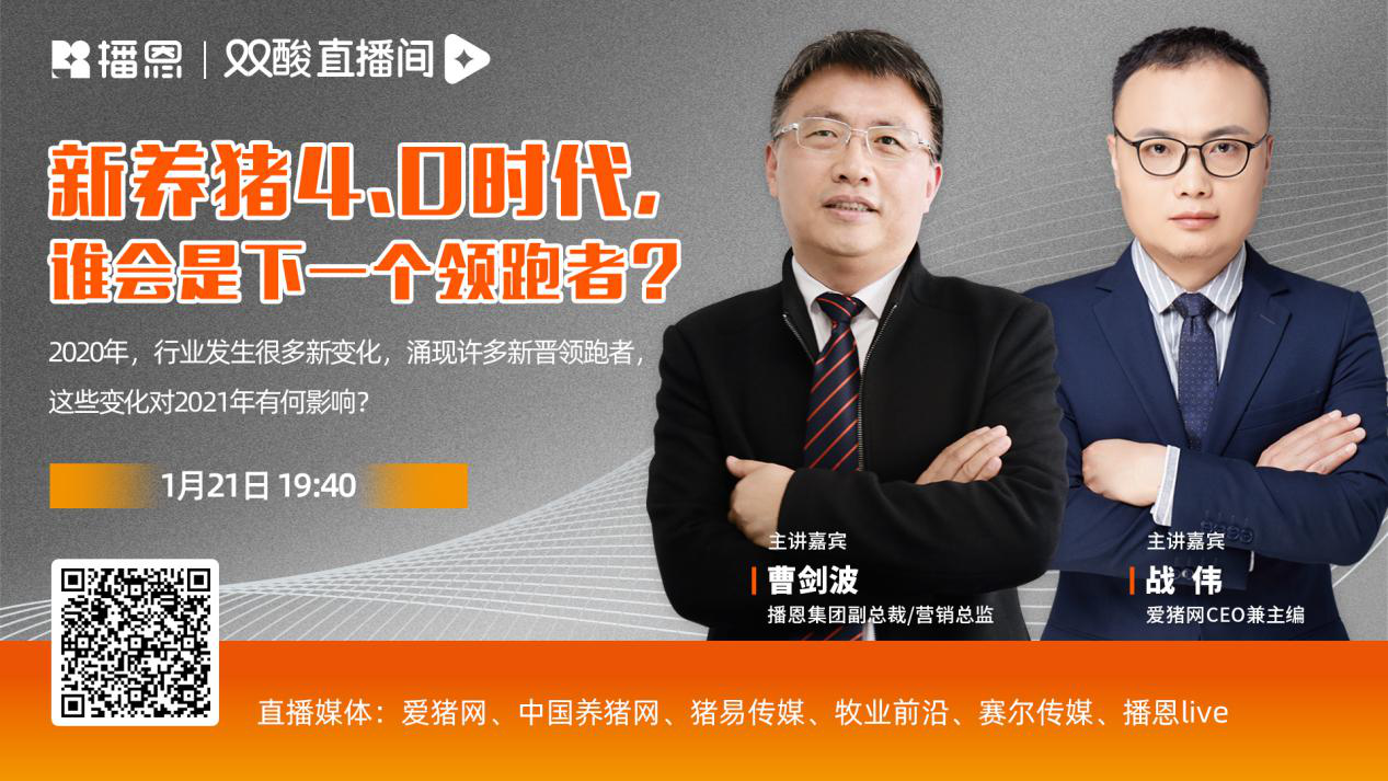 1月21日晚19:40,播恩雙酸直播間2021開年直播如期而至,這期的主題是——“養(yǎng)豬新4.0時(shí)代,誰會(huì)是下一個(gè)領(lǐng)跑者”。此次直播,特別邀請(qǐng)了播恩集團(tuán)副總裁/營(yíng)銷總監(jiān)曹劍波與愛豬網(wǎng)CEO/主編戰(zhàn)偉兩位行業(yè)大咖做客直播間,以訪談式直播為方式,交流農(nóng)牧話題。兩位嘉賓從2020年行業(yè)現(xiàn)象著手,高度凝練2020的挑戰(zhàn)與收獲,進(jìn)而思考2021年豬業(yè)趨勢(shì)……攜農(nóng)牧朋友告別2020,共同迎接2021年辛丑金牛年。