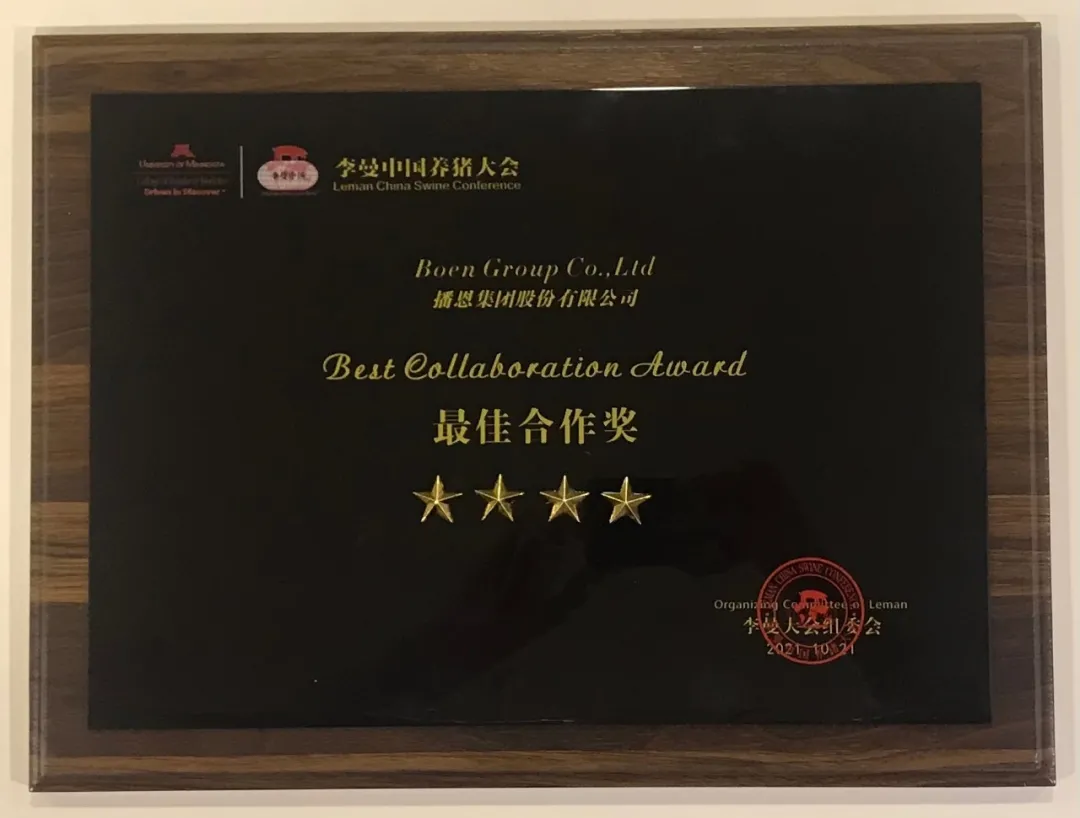 2021年10月20-22日,第十屆李曼中國養(yǎng)豬大會(huì)暨世界豬業(yè)博覽會(huì)在重慶國際博覽中心舉行。大會(huì)期間,播恩集團(tuán)領(lǐng)取了李曼大會(huì)組委會(huì)頒發(fā)的“最佳合作獎(jiǎng)”。
