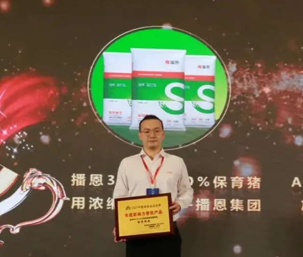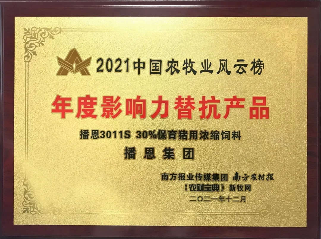 2021年12月11日,第11屆中國農(nóng)牧業(yè)風云會、農(nóng)財寶典新牧網(wǎng)年會暨廣東省現(xiàn)代畜禽產(chǎn)業(yè)園研討會在廣州閉幕。在2021年中國農(nóng)牧業(yè)風云榜頒獎會上,播恩集團產(chǎn)品“播恩3011S 30%保育豬用濃縮飼料”榮獲“年度影響力替抗產(chǎn)品”獎項,播恩集團技術(shù)服務(wù)副總監(jiān)巴少波上臺領(lǐng)取獲獎牌匾。
