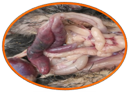 1.3.6 若多種球蟲混合感染,則腸管粗大,腸粘膜上有大量的出血點,腸管中有大量的帶有脫落的腸上皮細胞的紫黑色血液。