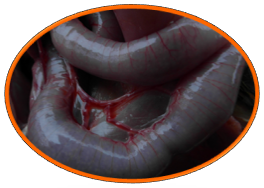 2.3.2 腸道:剖檢可見小腸粘膜肥厚,充血,可見蟲體吸附于小腸粘膜上。寄生部位呈針尖大結(jié)節(jié)樣病變,中央凹陷。大量蟲體聚集時,引起腸堵塞,可造成腸破裂和腹膜炎。嚴重時導致死亡。見圖4。