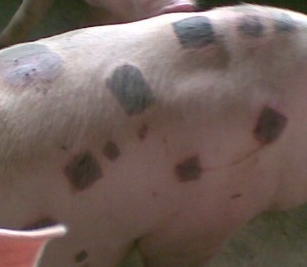 由豬丹毒桿菌感染引起出現(xiàn)的紫紅色斑塊,治療用鹽酸頭孢噻呋注射液肌注,連用3-5天,全群添加阿莫西林或復(fù)方阿莫西林預(yù)防,連用7-10天.