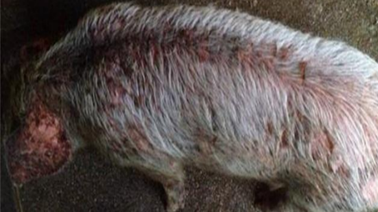 如豬只全身皮膚出現(xiàn)發(fā)紅發(fā)紫現(xiàn)象,一般是細(xì)菌、病毒、原蟲等混合感染引起的全身性敗血癥的特征。如非洲豬瘟、豬瘟、弓形體、附紅細(xì)胞體、敗血性鏈球菌等。這些疾病一般會(huì)伴發(fā)反復(fù)發(fā)燒,精神萎靡等癥狀。治療一邊用瘟毒齊抗+鹽酸頭孢噻呋混合肌注,一邊肌注干擾素,高燒者加注高免熱毒血清;飼料中添加板清顆粒,飲水中添加綠益態(tài)+維生素C,連用5–7天,治療及時(shí)、病狀較輕者能夠挽救。