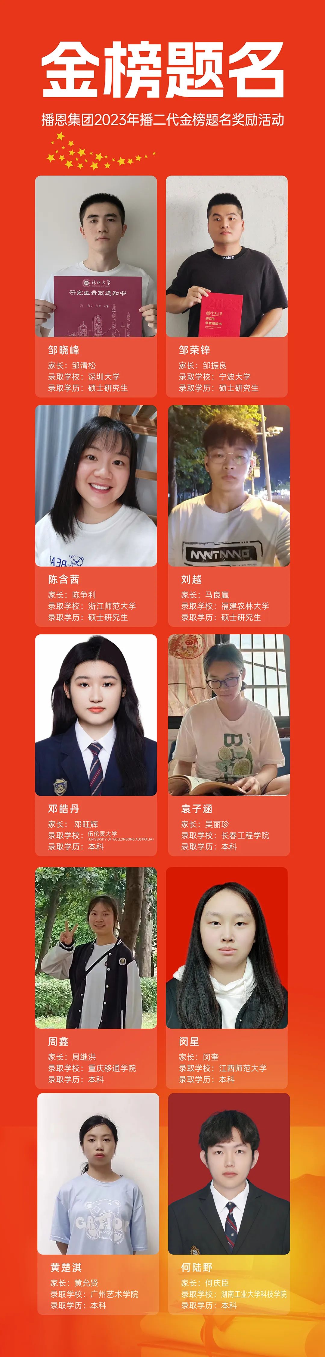 2023年集團職工子女有10人考入高校,其中碩士4人,本科6人。為鼓勵更多的“播二代們”成為有理想、有行動、有擔(dān)當?shù)那嗄?,同時也給職工帶來滿滿的歸屬感與榮耀感,集團除了現(xiàn)金獎勵外,還送上了董事長鄒新華先生的祝賀函、自著的《百煉成王—王陽明》一書、精美禮品等。我們也對其中一些具有代表性的家長進行了采訪,下面是他們的一些采訪紀實。