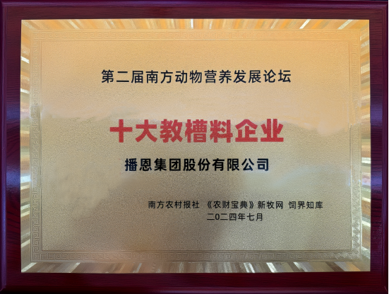 2024年7月14-16日,以“南方問道,融合知新”為主題的2024第二屆南方動物營養(yǎng)發(fā)展論壇在廣西南寧隆重召開。該論壇作為南方地區(qū)規(guī)模大、規(guī)格高、陣容強(qiáng)的動物營養(yǎng)領(lǐng)域盛會,吸引了近700位畜牧水產(chǎn)業(yè)的大咖齊聚。播恩集團(tuán)由欽州播恩總經(jīng)理楊春帶隊參與,并憑借在動物營養(yǎng)領(lǐng)域的卓越表現(xiàn)和優(yōu)質(zhì)的教槽料產(chǎn)品,在此次論壇上獲得了“十大教槽料企業(yè)”榮譽(yù)。