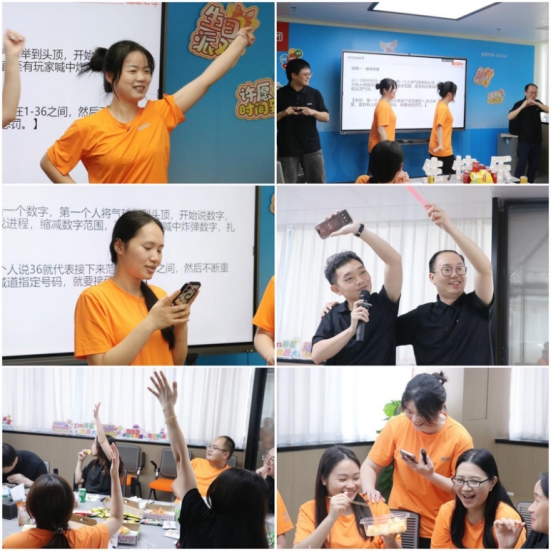 致辭結(jié)束后,生日會進(jìn)入互動環(huán)節(jié),現(xiàn)場也瞬間化作歡樂的海洋。美食香氣四溢間,各類趣味游戲輪番登場,徹底打破了平日里的工作嚴(yán)肅氛圍。在“表情包猜成語”環(huán)節(jié),技術(shù)人員一改往日專注敲代碼的沉穩(wěn)模樣,為了搶答成功,快速高舉手臂,甚至踮起腳尖,躍躍欲試的模樣引得全場笑聲不斷。最令人驚喜的當(dāng)屬法務(wù)和審計(jì)部門的“跨界表演”。這些平日里嚴(yán)謹(jǐn)認(rèn)真、專注于合同條款與數(shù)據(jù)表格的同事們,被青春洋溢的播恩學(xué)妹熱情邀請,臨時(shí)上陣挑戰(zhàn)《愛你》舞蹈。沒有排練、毫無經(jīng)驗(yàn)的他們,動作有的快半拍、有的慢半拍,甚至手腳“各自為政”,但卻絲毫不怯場,努力跟上節(jié)奏的認(rèn)真模樣,搭配著略顯笨拙的舞步,讓現(xiàn)場充滿歡樂的氣氛,歡呼聲與掌聲此起彼伏……一個(gè)個(gè)游戲,一個(gè)個(gè)互動,笑聲與音樂聲交織,繪就出一幅溫暖而熱烈的團(tuán)隊(duì)情誼畫卷。